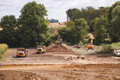 Les premiers travaux sur le tracé neuf concernent la réalisation de terrassements préparatoires à la réalisation de 6 ouvrages d’art situés dans la vallée de la Trégonce, entre les RD 27 et 64E.