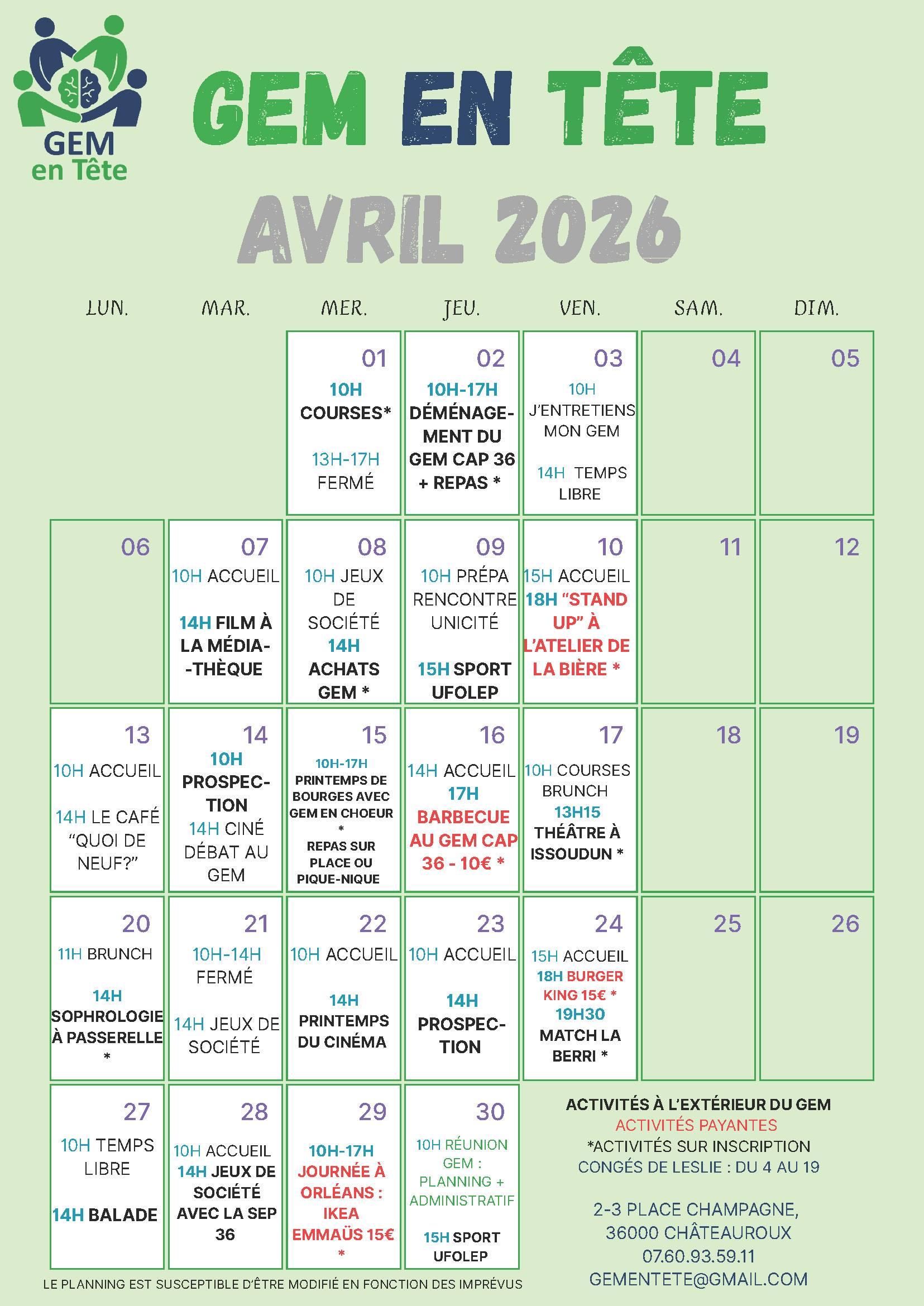 - Vendredi 3 avril : 10H J’ENTRETIENS MON GEM / 14H TEMPS LIBRE