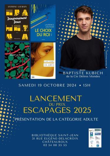 Le prix ESCAPAGES récompense les livres préférés des lecteurs de l’Indre, trente-six livres sont en compétition, répartis en neuf catégories d’âge ( + 2 ans / + 4 ans / + 6 ans / + 8 ans / + 10 ans / + 12 ans / Ados / Young Adult / Escapages +).