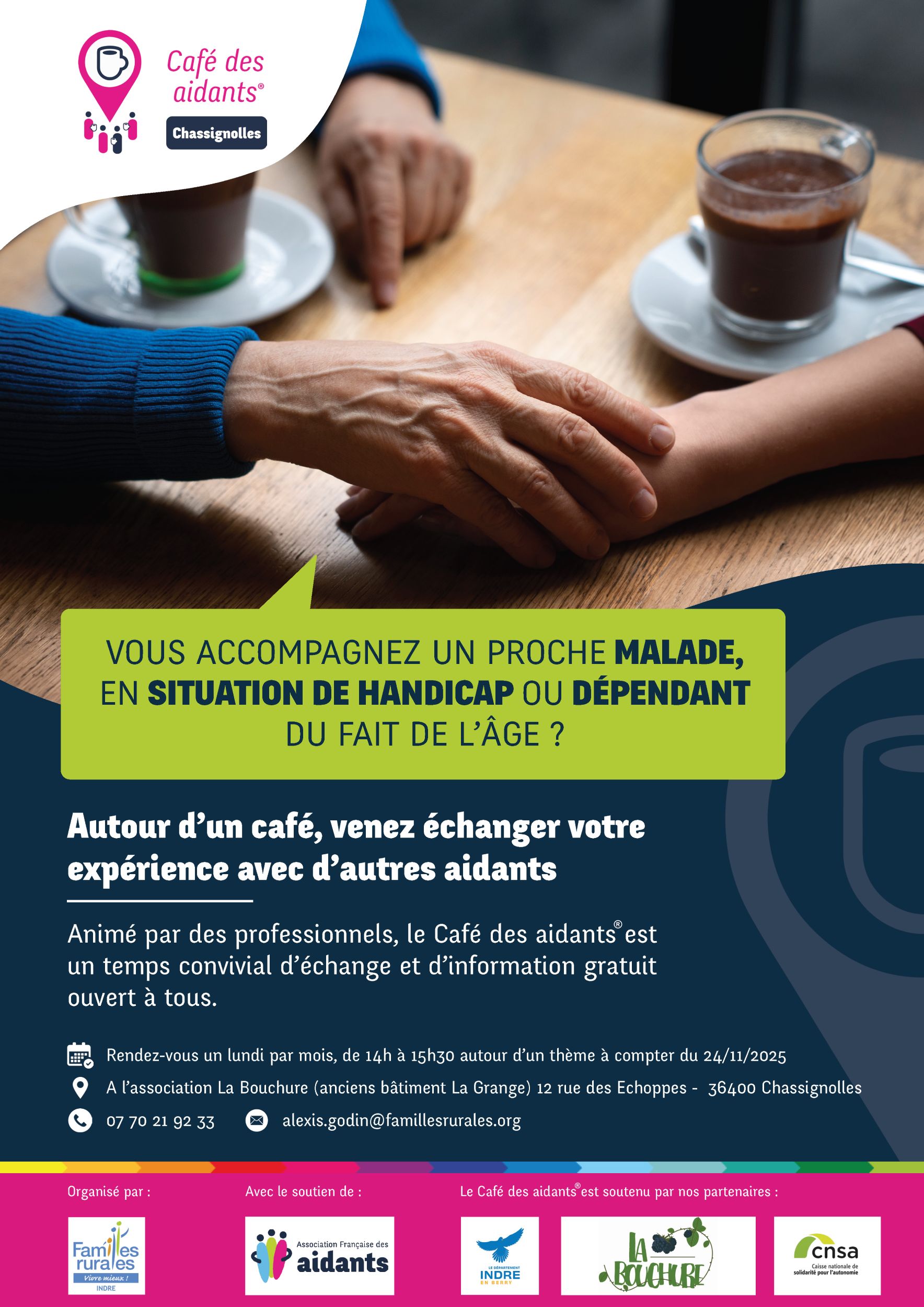 Vous accompagnez un proche malade, en situation de handicap ou dépendant du fait de l’âge ? Le café des aidants est un temps convivial d’échange et d’information gratuit ouvert à tous.