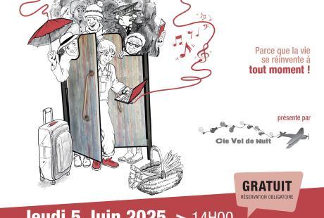 14h : « Une Nouvelle Saison » spectacle en chansons de la Compagnie Vol de Nuit Sur fond d'enquête policière menée par deux inspecteurs genre « pieds nickelés », quatre jeunes retraités font vivre musicalement et en chansons un lieu associatif où se croisent au rythme des saisons de multiples personnages hauts en couleurs. "Aux Potes Âgés", on rit, on cause, on chante surtout et on explore les pistes d'une retraite heureuse.