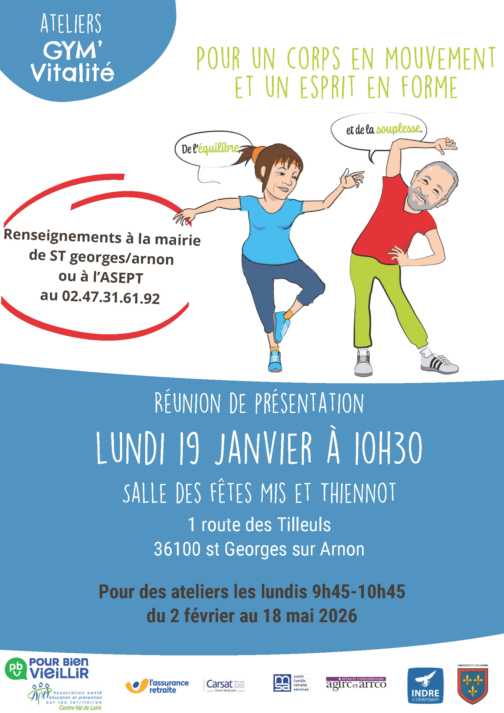 Lundi 19 janvier, venez nombreux à la réunion de présentation des ateliers gym'vitalité, qui aura lieu à Saint-Georges-sur-Arnon.
