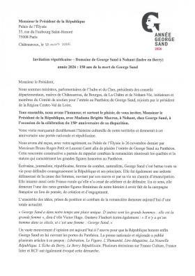 Le Département de l’Indre a adressé un courrier au Président de la République pour l’inviter à Nohant, au Domaine de George Sand, à l’occasion du 150e anniversaire de la disparition de l’écrivaine. Cette invitation, portée avec plusieurs élus et responsables du Berry et de la région Centre-Val de Loire, vise à donner à cet anniversaire une dimension nationale et républicaine.
