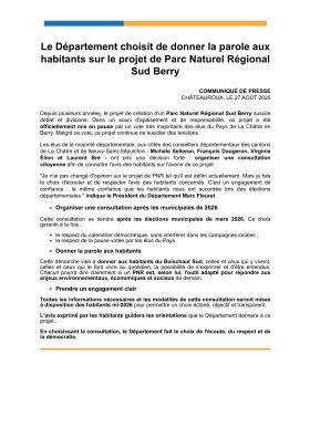 Les élus de la majorité départementale, aux côtés des conseillers départementaux des cantons de La Châtre et de Neuvy-Saint-Sépulchre - Michèle Selleron, François Daugeron, Virginie Élion et Laurent Bré - ont pris une décision forte : organiser une consultation citoyenne afin de connaître l'avis des habitants sur l'avenir de ce projet.