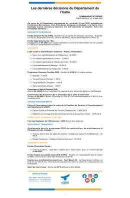 Fonds d’Action Rurale (FAR), répartition d’une partie des reliquats cantonaux : Ardentes (13.522 €), Buzançais (78.641 €), Levroux (89.990 €), Neuvy-Saint-Sépulchre (74.847 €).