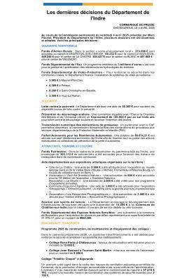 Au cours de la Commission permanente du vendredi 4 avril 2025 présidée par Marc Fleuret, Président du Département de l'Indre, plusieurs dossiers ont été examinés et adoptés.
