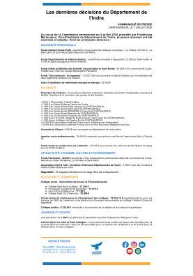 Fonds d’Action Rurale (FAR), répartition d’une partie des reliquats cantonaux : La Châtre (38 230 €), Le Blanc (69 276 €) et Neuvy-Saint-Sépulchre (55 490 €).
